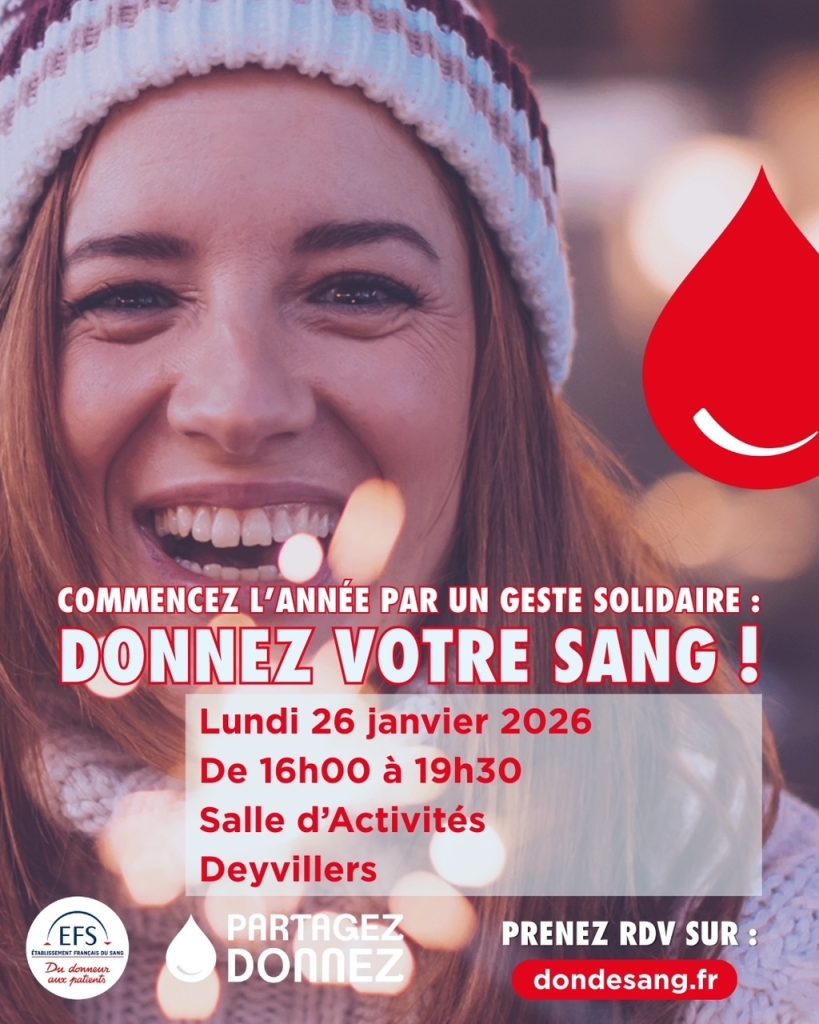 Prochaine collecte de sang lundi 26 janvier de 16h à 19h30 à…